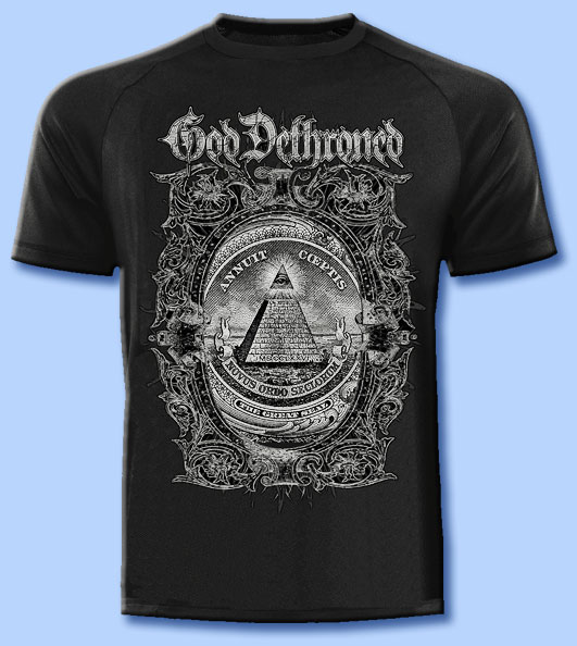Sopra: una t-shirt commercializzata dai God Dethroned sui cui campeggia il Gran Sigillo degli Stati Uniti, al cui centro c'è una Piramide tronca su cui troneggia l'Occhio onniveggente. Più chiaro di così...