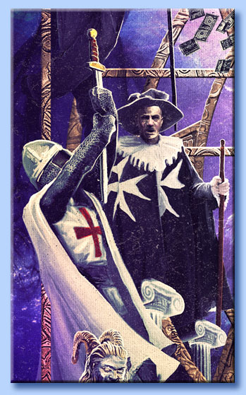 Sulla sinistra, a lato della simbologia centrale, c'è un Cavaliere Templare con tanto di armatura e spada. Al suo fianco c'è un altro personaggio che potrebbe essere un Gran Maestro dell'Ordine. Ai suoi piedi si scorgono due colonne che sono un riferimento alle due colonne (Joachim e Boaz) che sorgono all'entrata della Loggia massonica.