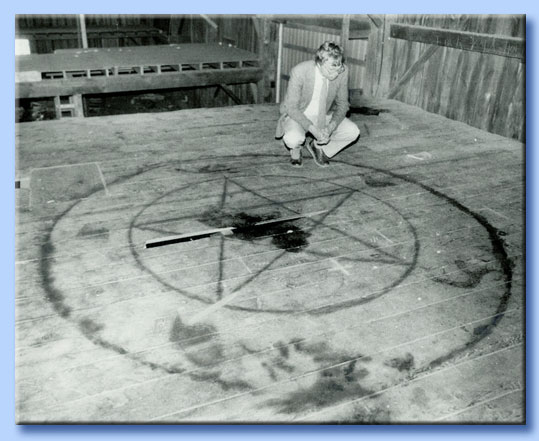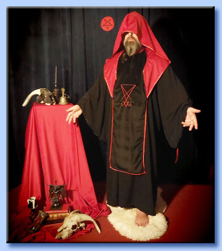 Sopra: sacerdote satanico: Sul petto ha il Sigillo di Lucifero, mentre sulla parete c'è il Pentacolo rovesciato.